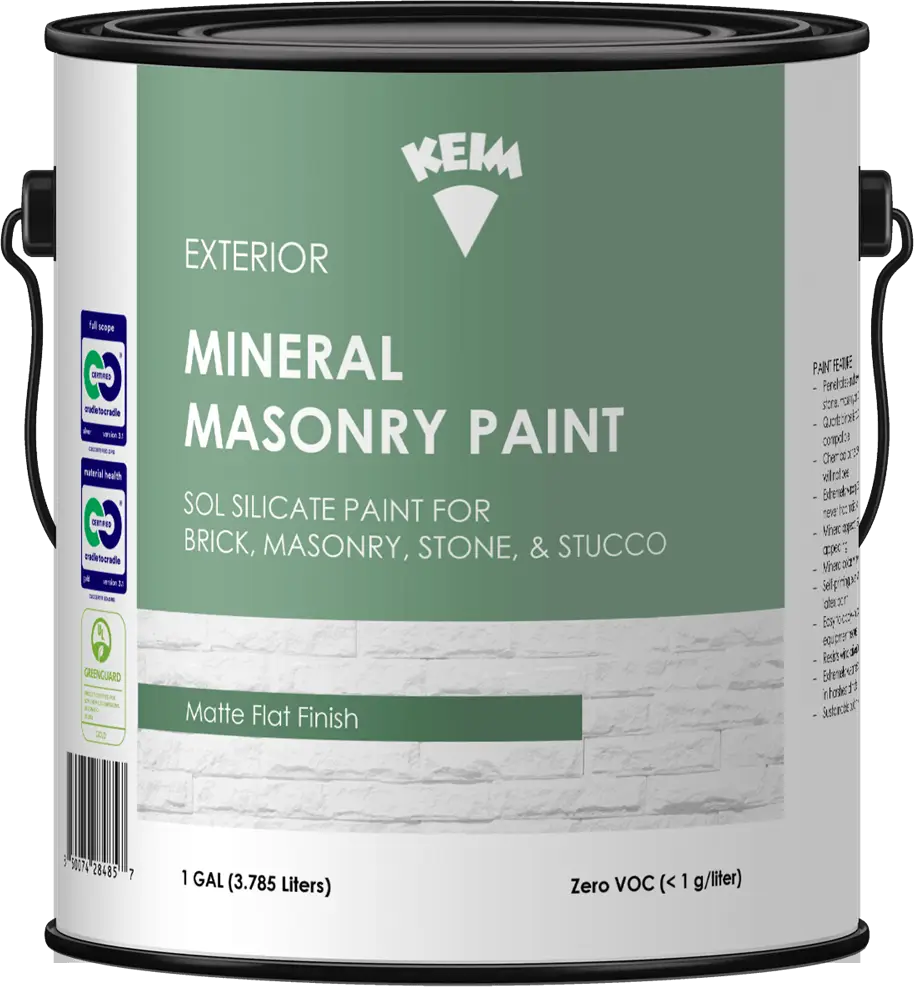 Mineral Masonry Paint is a low-maintenance, pure potassium silicate paint that delivers extreme durability, color stability and a beautiful mineral matte flat finish. Mineral Masonry Paint penetrates deep within and onto the masonry surface for permanent adhesion, literally becoming part of it. The mineral microporous surface breathes and lets moisture from the masonry surface freely escape so it will never blister or peel. It never traps moisture in your walls. The high pH (alkaline) surface is naturally mold and mildew resistant, toxin-free, and environmentally friendly. Keim, the inventor of mineral silicate paints more than 140 years ago, first formulated Mineral Masonry Paint in the 1960’s. Today it delivers decades of successful track record and you can count on mineral colors that will not fade for decades on end.
